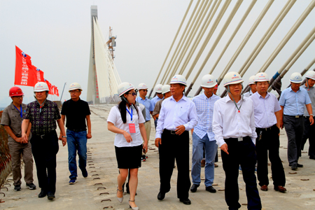 6月13日上午,柬埔寨王国公共工程与运输部国务秘书林西德奈在交通投资MK(中国)总工程师关健、工程技术部长王辉,MK(中国)公司董事长刘前进及中原高速新登分公司领导陪同下对商登高速郑州境段跨南水北调大桥施工和路面工程施工进行现场观摩。