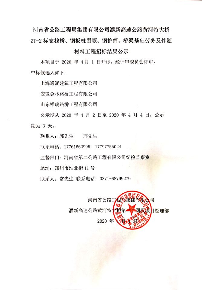 阳新高速公路黄河特大桥ZT-2标支栈桥、钢板桩围堰、钢护筒、桥梁基础劳务及伴随材料工程招标结果公示