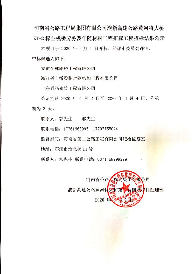 阳新高速公路黄河特大桥ZT-2标主栈桥劳务及伴随材料工程招标结果公示